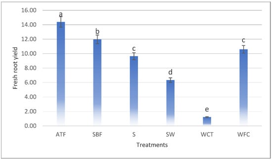 In season I, the highest fresh root yield (Figure 3, Scheme 3) achieved with ATF (14.39 t ha−1) followed by SBF (11.98 t ha−1) whereby the yields in those two treatments were higher than the yield with WFC (10.60 t ha−1). Both of the synthetic mulches achieved statistically significant higher fresh root yield than those achieved for both controls and both organic mulch treatments. The S mulch achieved similar yield (9.64 t ha−1) as well as WFC (10.60 t ha −1), but SW showed lower fresh root yield (6.34 t ha−1) in comparison to the S treatment. Similar trend of fresh root yield was observed in season II (Figure 4). Again, the highest yield (13.18 t ha−1) was achieved for ATF without statistical differences with SBF (11.40 t ha−1). Also, there were no observed statistical differences between SBF (11.40 t ha−1) and S (9.82 t ha−1), as well as between S and WFC (9.70 t ha−1). The lowest yield was observed in WCT: 2.14 t ha−1.
