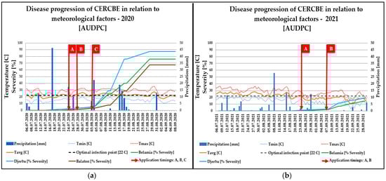 (a) Disease Progression of Cercospora Leaf Spot (CLS) in Three Sugar Beet Varieties (‘Smart Belamia’, ‘Smart Djerba’, and ‘Balaton’) under Favorable Weather Conditions in Hungary, 2020. (b) Delayed CLS Progression in Sugar Beet Varieties (‘Smart Belamia’ and ‘Smart Djerba’) under Unfavorable Weather Conditions in Hungary, 2021.