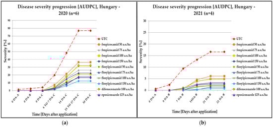 In both study years, all ten trials evaluated the efficacy of fenpicoxamid (=InatreqTM; formulation code: GF-3308; at 50 g a.s./L, EC; Corteva Agriscience LLC, Indianapolis, IN, USA) and florylpicoxamid (=AdaveltTM; formulation code: GF-3840; at 100 g a.s./L, EC; Corteva Agriscience LLC, Indianapolis, IN, USA) against Cercospora leaf spot (caused by CERCBE) in sugar beet. The doses to be tested were selected based on the dose allowed in the cereals for fenpicoxamid [56,63,64,65,66,67], and the same dose was chosen for florylpicoxamid, which is still under registration. Fenpicoxamid was tested at four application rates: 50, 75, 100, and 150 g a.s./ha, equivalent to 1.0, 1.5, 2.0, and 3.0 L/ha, respectively. Florylpicoxamid was also tested at four rates: 50, 75, 100, and 150 g a.s./ha, equivalent to 0.5, 0.75, 1.0, and 1.5 L/ha, respectively. The reference products were selected from the DMIs (FRAC Group 3). They were the strongest available azoles in the Hungarian market, such as difenoconazole (Score 250 EC; Syngenta AG, Basel, Switzerland) and epoxiconazole (Opus 125 EC; BASF SE, Ludwigshafen, Germany). Score 250 EC was applied at a rate of 100 g a.s./ha for straight comparison to the same rate of picolinamides and Opus 125 EC was applied at a rate of 125 g a.s./ha for comparison to the highest tested rate (150 g a.s./ha) of picolinamides. The dose rates of the reference products were selected to consider the highest rates of registered products (Score 250 and Opus) across EU [63,64,68,69] to validate a new solution, which was the aim of this study.