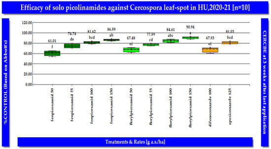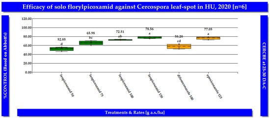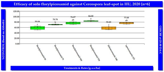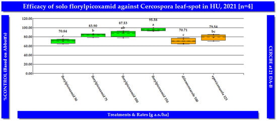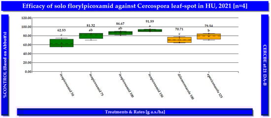 In the same ten field trials conducted in Hungary, florylpicoxamid (=AdaveltTM, formulation code: GF-3840; Corteva Agriscience LLC, Indianapolis, IN, USA) demonstrated exceptional efficacy in managing CLS in sugar beet in both study years consistently (Figure 5 and Figure 6). When applied at a rate of 150 g a.s./ha between BBCH growth stages 38 and 39, florylpicoxamid achieved a remarkable 90.93% control of CLS. At lower application rates, florylpicoxamid maintained a high level of disease control. When applied at 100 g a.s./ha, it provided 84.23% control, while at 75 g a.s./ha, it delivered 77.63% control. Even at the lowest tested rate of 50 g a.s./ha, florylpicoxamid still effectively controlled CLS, achieving 67.48% reduction in disease incidence. Florylpicoxamid consistently outperformed the standard fungicides difenoconazole and epoxiconazole in controlling CLS. At a rate of 75 g a.s./ha, florylpicoxamid provided significantly better control (77.63%) than difenoconazole applied at 100 g a.s./ha (67.91%). Moreover, florylpicoxamid at 100 and 150 g a.s./ha demonstrated comparable or superior efficacy to epoxiconazole at 125 g a.s./ha The presented results demonstrate that florylpicoxamid applied at a rate of 75–100 g a.s./ha, delivered optimal control of CLS in sugar beet (Table 2).