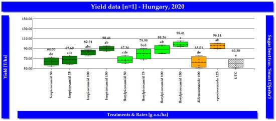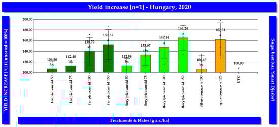 Effect of picolinamides on sugar beet yield in Hungarian field trials conducted in 2020. (Different letters indicating where significant differences are between treatment means).