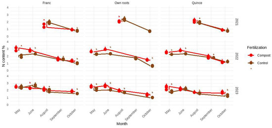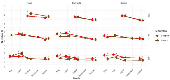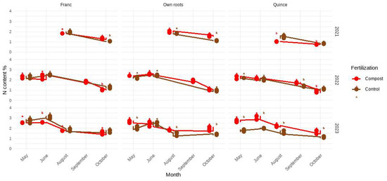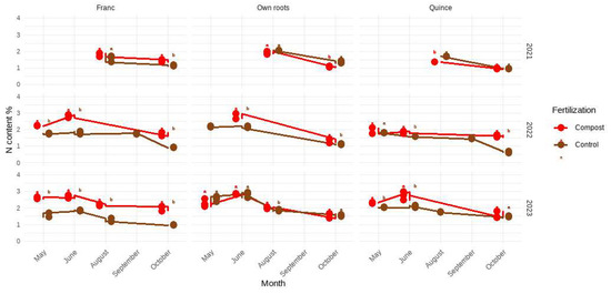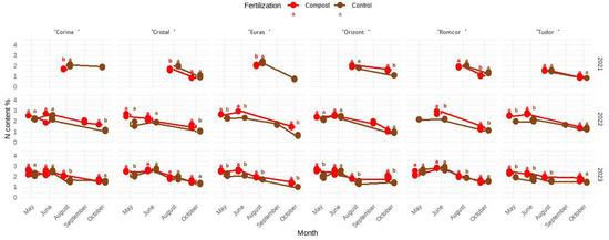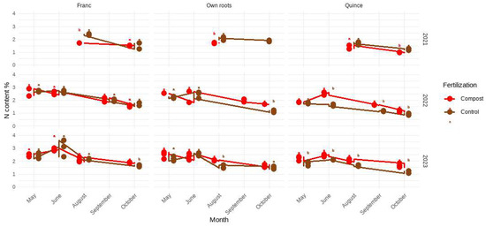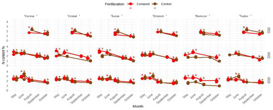 Butcaru, A.C.; Mihai, C.A.; Moț, A.; Gogoț, R.; Hoza, D.; Stănică, F. Circular Pear Production Using Compost Fertilization: Influence on Tree Growth and Nitrogen Leaf Concentration. Horticulturae 2024, 10, 1209. https://doi.org/10.3390/horticulturae10111209