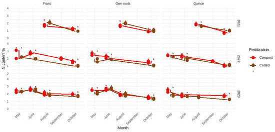 3.1. Compost Application’s Influence on Nitrogen (N) Absorption in the Pear Tree Leaves and Carbon Concentration Is Correlated to Cultivar × Rootstock