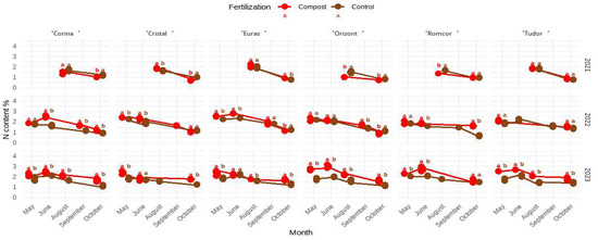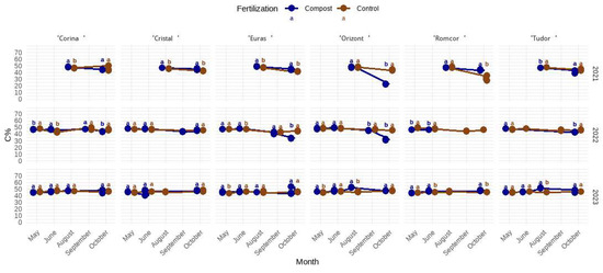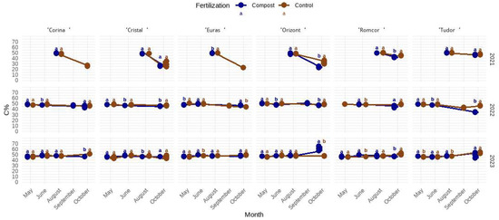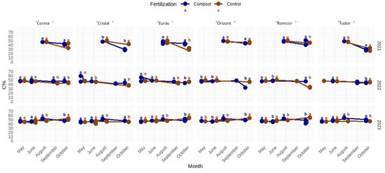 | ‘Corina’ | Franc | Compost | 47.01 (a) | 41.67 (a) | 47.71 (a) | 47.45 (a) | 47.52 (a) | 46.02 (a) | 45.56 (a) | 52.14 (a) | 47.45 (b) |