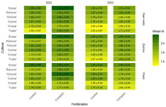 | Quince | Compost | 47.01 (a) | 45.07 (a) | 48.03 (a) | 47.6 (a) | 45.59 (a) | 45.64 (a) | 45.44 (a) | - | 48.10 (a) | |