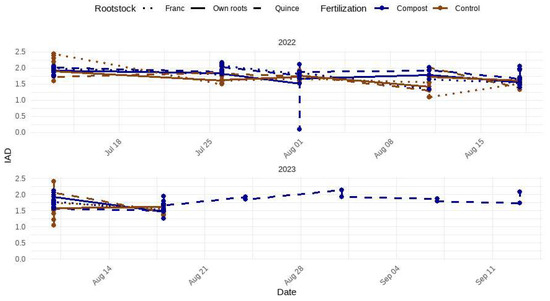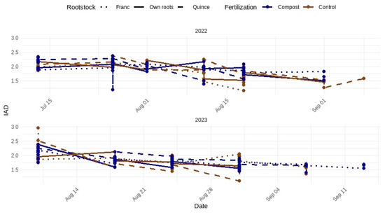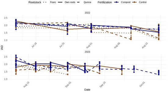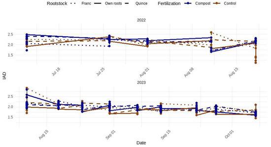 2.5. Fruit Ripening (Phenophases BBCH70-87) Corresponding to the Experimental Variants, Measured in IAD (Using a DA-Meter)