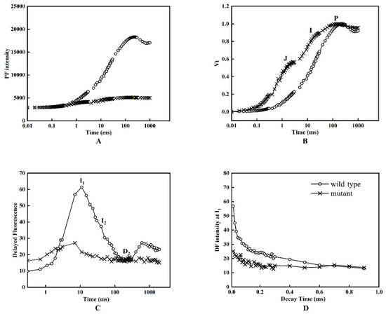 The PF curve of the mutant leaves exhibited significant changes, including a marked decrease in the maximum fluorescence (Fm). Additionally, the transitions between the J-I and I-p phases disappeared, and the J-step approached the p level (Figure 2A). To facilitate a comparison, the PF curve was standardized from step O (20 μs) to step p (300 ms) (Figure 2B). In the mutant, Vt was elevated as a whole, with VJ and VI showing particularly significant increases. At the same time, the I2 peak was not obvious, and the DF decay between the I1 and I2 peaks nearly disappeared; this observation aligns with the OJIP transient phase of PF (Figure 2C). Additionally, the decay kinetics of DF at the I1 peak showed a significant decrease in the mutant (Figure 2D).