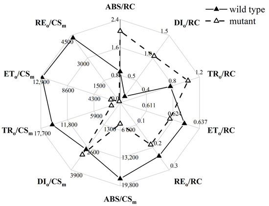 Radar plot of energy fluxes in mutant and wild type Torreya. The radar plot reflected specific activity values at individual PSII reaction centers (RCs) and cross-sections (CSs). Each data point represents the mean value derived from three replicate measurements.