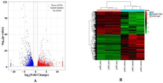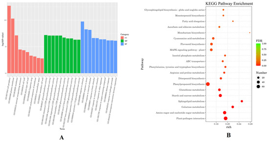 In this study, differentially expressed genes (DEGs) were identified using the criteria |log2FoldChange| > 1 and a corrected Padj value < 0.05. A total of 4607 DEGs were detected between wild-type and mutant samples, with 2433 being up-regulated and 2174 being down-regulated. The overall distribution of mRNA is illustrated in a volcano plot (Figure 4A). Hierarchical clustering of the DEGs was performed, with leaves of the same type being clustered together. This clustering suggests that genes within the same cluster may have similar biological functions. Additionally, the abundance of DEGs was visually represented using FPKM values and color coding (Figure 4B). GO annotation of these DEGs was conducted based on the categories of Cellular Components (CCs), Molecular Functions (MFs), and Biological Processes (BPs) to evaluate their potential functions. The results indicated that genes associated with the ‘cell periphery’ and the ‘plasma membrane’ were the most highly enriched; these genes were classified under the CC category (Figure 4A). Following this, ‘response to stimulus’ was the most enriched category within Biological Processes (BPs). In the Molecular Function (MF) category, ‘glucosyltransferase activity’ exhibited the highest level of enrichment (Figure 5A). Based on the KEGG analysis, a total of 1235 DEGs were identified and enriched in 119 pathways. The top 20 enrichment pathways, based on the false discovery rate, are shown in Figure 4B. The most significantly enriched KEGG pathways included ‘plant–pathogen interaction’, ‘amino sugar and nucleotide sugar metabolism’, and ‘galactose metabolism’ (Figure 5B).