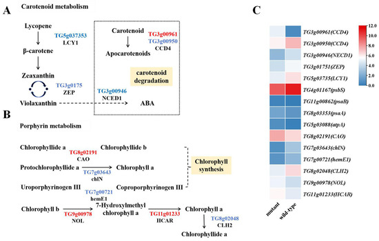 Among these genes, chlN, CAO, and hemE1 are involved in chlorophyll synthesis, while HCAR, NOL, and CLH2 are associated with chlorophyll degradation. The expression levels of CAO (TG8g02191), NOL (TG9g00978), and HCAR (TG11g01233) were significantly up-regulated in the mutant compared to the wild type. Conversely, the expression levels of chlN (TG7g03643), hemE1 (TG7g00721), and CLH2 (TG8g02048) were down-regulated in the mutant relative to the wild type (Figure 5B). The expression levels of these genes are further detailed in Figure 6C.