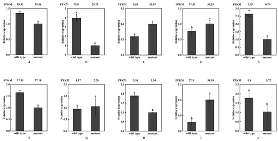 The expression levels of DEGs in wild-type and mutant Torreya. (A) Gene ID: TG8G02048 (CHL2). (B) Gene ID: TG5G03735 (LCY1). (C) Gene ID: TG3G00961 (CCD4). (D) Gene ID: TG9G00978 (NOL). (E) Gene ID: TG7G03643 (chlN). (F) Gene ID: TG3G0175 (ZEP). (G) Gene ID: TG8G003353 (psaA). (H) Gene ID: TG4G00167 (psbS). (I) Gene ID: TG11G01233 (HCAR). (J) Gene ID: TG3G00946 (NECD1). Each error bar represents the SD calculated from three biological replicates, each of which includes three technical replicates.
