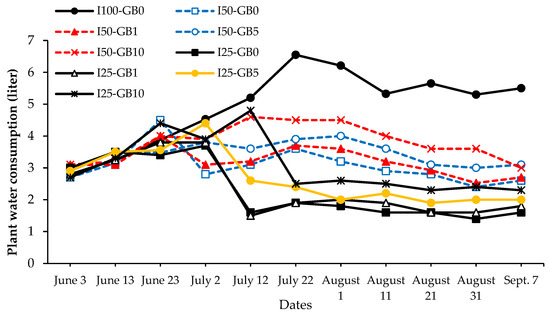 Plant water consumption ranged between 25.1 L (I25-GB0) and 54.2 L (I100-GB0 control treatment) (Table 1). As GB rates increased, water consumption increased. The 10-day water consumption is presented in Figure 1. Water consumption values of the I25 treatments for all the GB rates decreased after the water stress application date (July 2nd) depending on the applied irrigation water amounts. Just after starting the drought stress applications (July 1st), ET values decreased for all the treatments except I100.