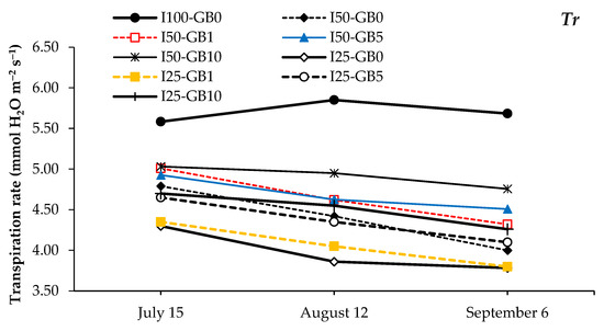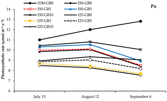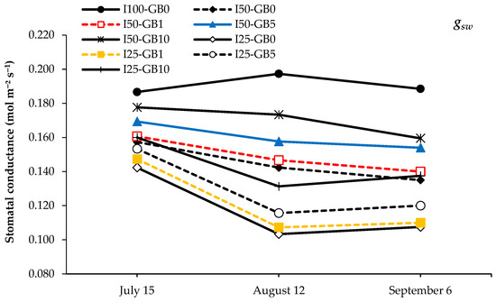 Figure 2 shows fluctuations in Pn values after beginning the water deficit applications. All the Pn values in the water deficit treatments decreased up to the end of the growing season. Statistical analysis was performed in the last Pn, gsw, and Tr measurements (6 September) (Table 2). GB rates positively affected the Pn, gsw, and Tr measurements. The highest Pn was determined in I50-GB10 with 10.06 μmol m−2 s−1, and I25-GB0 provided the lowest result with 7.55 μmol m−2 s−1. The treatments having 75% water deficit with no GB and 1% GB applications provided the lowest Pn results. The gsw was measured three times during the growing period (Figure 3). All the gsw results of the young pear trees showed fluctuations. The last gsw measurements (6 September) were made for statistical analysis. The I100 treatment having no GB application provided the highest gsw result (0.189 mol m−2 s−1). Increasing GB dose applications (GB5: 5 mg L−1 and GB10: 10 mg L−1) were not significantly different. The Tr results had a similar trend with Pn and gsw. Tr was at the highest level in the middle of the growing season (August) with 5.85 mmol H2O m−2 s−1. Tr increased until the middle of the growing season in I100 (no drought stress) but it was in a trend of decreasing near the end of the growing season. The other treatments that applied 50% and 75% water deficit were in a trend of decreasing the whole season. The lowest Tr results were determined in I25GB0 and I25GB1 with 3.78 and 3.80 mmol H2O m−2 s−1, respectively. Statistical analysis was carried out for each drought treatment and GB dose on Pn, gsw, and Tr. The drought treatments had an important effect on all the physiological parameters measured in this study. There was no significant difference according to GB doses (Figure 4).