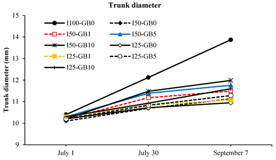 Trunk diameter increased in all the young pear trees during the growing period, but the rates of increase were limited by water deficit and GB dose applications (Table 3 and Figure 5). Different water deficit rates and GB doses had different effects on trunk diameter values (p < 0.01). The highest trunk diameter was determined in no water deficit treatment. The I50 and I25 treatments with no GB dose and 50% water deficit treatment with 1 mg L−1 GB provided the lowest trunk diameter. Trunk growth increased after the water deficit was applied on July 1st in all the treatments. GB10 and GB5 applications in 50% water deficit treatment (I50) provided the highest increasing rates, 17.5% and 14.2%, respectively. Statistical analysis was performed for each drought treatment and GB dose on trunk diameter, fresh root weight, and shoot length. Drought treatments had an important effect on all the physiological parameters measured in this study. There was no significant difference according to GB doses.