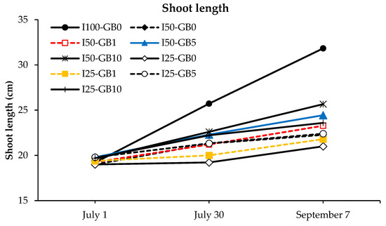 Different water deficit applications and GB doses affected shoot length (* p < 0.05). GB5 and GB10 applications in the 50% water deficit treatments provided the highest shoot length in the water deficit treatments (Table 5). Shoot length increased for all the young pear trees during the growing season although a water deficit was applied (Figure 6). Increasing rates ranged from 10.5% to 65.8%. The effects of GB doses in the I25 treatment were similar on shoot development.
