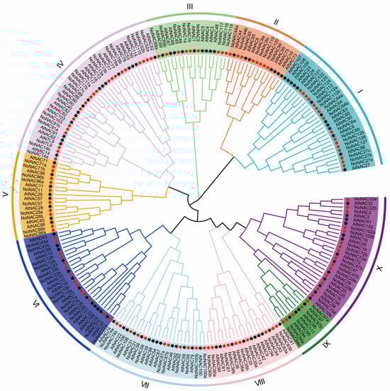 As shown in Figure 1, a total of 119 members of the NAC family were identified in watercress by HMMER and blast searches. In order to understand the evolutionary relationship of the NAC family, we constructed a phylogenetic tree for NAC protein sequences from watercress and Arabidopsis (Figure 1). The result of the phylogenetic analysis revealed that 119 NoNAC genes and 108 AtNAC genes could be further divided into ten subgroups. The NoNAC genes were distributed across ten subgroups, each of them containing 5–21 NoNAC genes. Among them, subgroups I, IV, and X have large numbers of NoNAC genes, including 21, 16, and 15 members, respectively. The number of branches in subgroups II, III, V, and IX is relatively small, containing 8, 9, 10, and 5 NoNAC genes, respectively (Figure 1). In addition, the distribution of NAC genes in watercress and Arabidopsis was similar across subgroups, and each subgroup contained NAC family members from both watercress and Arabidopsis, suggesting a high degree of homology between watercress and Arabidopsis NAC family members.