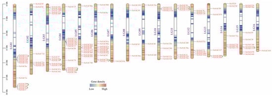 In the previous research of the watercress genome project in our laboratory, it was found that the watercress has 16 chromosomes (the project has not been concluded, and the paper and genomic data have not been published). To comprehend the distribution of NoNAC genes across watercress chromosomes, we generated a chromosomal distribution diagram of NoNAC genes. As shown in Figure 2, each chromosome contains the NoNAC genes. Chromosomes LG01 and LG04 had the most members of the NoNAC family, both containing 13 genes of the family, followed by LG03 (12), LG06 (12), LG05 (10), LG11 (9), LG15 (9), LG12 (8), LG10 (7), LG02 (6), LG14 (6), LG13 (5), LG08 (4), and LG09 (3). The least NoNAC family members were located in chromosomes LG07 and LG16, with one gene, respectively (Figure 2). In addition, we found that some of the NoNAC genes distributed on chromosomes LG01, LG04, LG10, and LG11 formed gene clusters. Via tandem duplication analysis, we found that NoNAC17c, NoNAC17a, NoNAC5, NoNAC116, NoNAC49, NoNAC1a, NoNAC56, NoNAC19, NoNAC52a, NoNAC114, NoNAC117, NoNAC118, NoNAC1b, NoNAC78a, NoNAC77, NoNAC121, NoNAC124, NoNAC112b, NoNAC69b, NoNAC69a, NoNAC52b, and NoNAC115 are tandemly repeated genes (Figure 2). Among them, the genes NoNAC5, NoNAC116, NoNAC49, and NoNAC1a distributed on chromosome LG01 formed a gene cluster, and they all belonged to subgroup III. The genes NoNAC117, NoNAC118, and NoNAC1b distributed on chromosome LG04 also form a gene cluster, and they all belong to subgroup III as well. Genes such as NoNAC121, NoNAC124, and NoNAC112b, which were located in chromosome LG11, also formed gene clusters, and all of them belonged to subgroup I. Most of these gene clusters were composed of genes from the same subgroup, but there were exceptions, such as NoNAC11, NoNAC12b, NoNAC13b, NoNAC14a, NoNAC15b, and other genes that also formed gene clusters (Figure 2), but they did not belong to the same subgroup.
