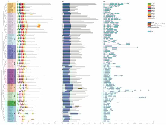 The NAC family’s Pfam number was obtained from the Pfam database (http://pfam-legacy.xfam.org, accessed on 17 December 2023). Then, the Simple HMM Search and Blast tools from TBtools v2.021 software [20] were used to search for NAC family genes in watercress, with a screening standard E-value < 1 × 10−10. The watercress genome used was obtained via whole-genome sequencing in our laboratory (this genome project has not yet been concluded, and relevant genomic data have not yet been published). The conserved domains were analyzed using the Batch CD-Search tool in the NCBI database (https://www.ncbi.nlm.nih.gov, accessed on 17 December 2023). Afterward, the candidate genes were screened again.