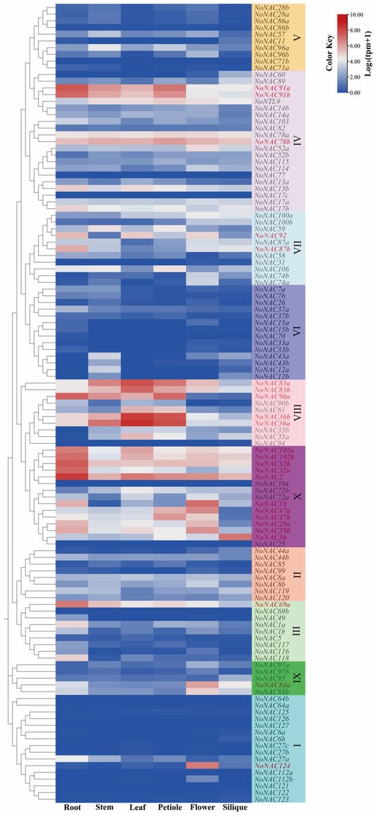 The transcript abundance of NoNAC genes in different tissues of watercress. Heatmap colors indicate the log2-transformed expression values of NoNAC genes. Red and blue colors indicate a higher and lower expression of the gene, respectively. Genes presented in red color are discussed in the text.