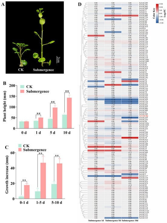 Plant height change and expression analysis of NoNAC genes under flooding stress. (A) After 10 days of flooding treatment, the growth state of the watercress, bar = 2 cm. (B) The plant height of watercress in the control group and submergence group. Data represent mean ± SD with n = 20. Asterisks indicate significant differences: ** p < 0.01. (C) Increase in watercress plant height in control and submerged groups at each time period of flooding treatment. Data represent mean ± SD with n = 20. Asterisks indicate significant differences: ** p < 0.01. (D) The expression levels of NoNAC genes in the transcriptome of stem segments after flooding treatment. Heatmap colors indicate the log2FC values of NoNAC genes, and the numbers on the heatmap colors are the log2FC values. Red indicates up-regulation, blue indicates down-regulation, and light grayish represents genes that are neither up- nor down-regulated.