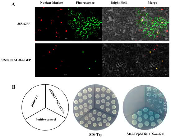 To determine the NoNAC36a protein location in plant cells, A. tumefaciens of the recombinant vector (35S:NoNAC36a-GFP) and nuclear Marker were mixed and then injected into tobacco leaves. Then, the fluorescence signal of NoNAC36a was observed via a laser confocal microscope. The results revealed that the 35S:GFP fluorescence signal could be observed in the cytoplasm and nuclei of tobacco leaves transformed with 35S:GFP. In tobacco leaves transformed with 35S:NoNAC36a-GFP, the fluorescence signal was restricted to the nuclei and overlapped with the nuclear marker signal (Figure 6A). Then, NoNAC36a transactivation activity was verified in yeast cells. The results revealed that the yeast strain transformed with pGBKT7-NoNAC36a could grow normally and turn blue on SD/-Trp/-His medium (Figure 6B). Therefore, NoNAC36a is a nuclear-localized protein with transactivation activity.