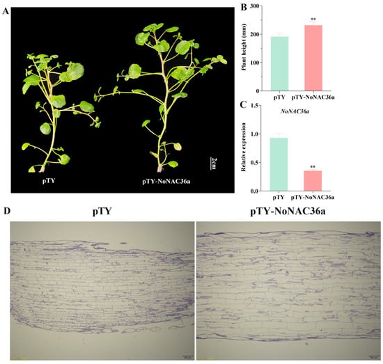 NoNAC36a silencing of watercress induced by virus. (A) Phenotypic observation of pTY empty vector plant (left) and NoNAC36a-silenced plant (right), bar = 2 cm. (B) Statistics on plant height for pTY empty vector plants and NoNAC36a-silenced plants. Data represent mean ± SD with n = 3. Asterisks indicate significant differences: ** p < 0.01. (C) The expression of NoNAC36a in pTY empty vector plants and NoNAC36a-silenced plants. Data represent mean ± SD with n = 3. Asterisks indicate significant differences: ** p < 0.01. (D) Stem longitudinal section observation of pTY empty vector plant and NoNAC36a-silenced plant, bar = 200 μm. Magnification: 2.52×.