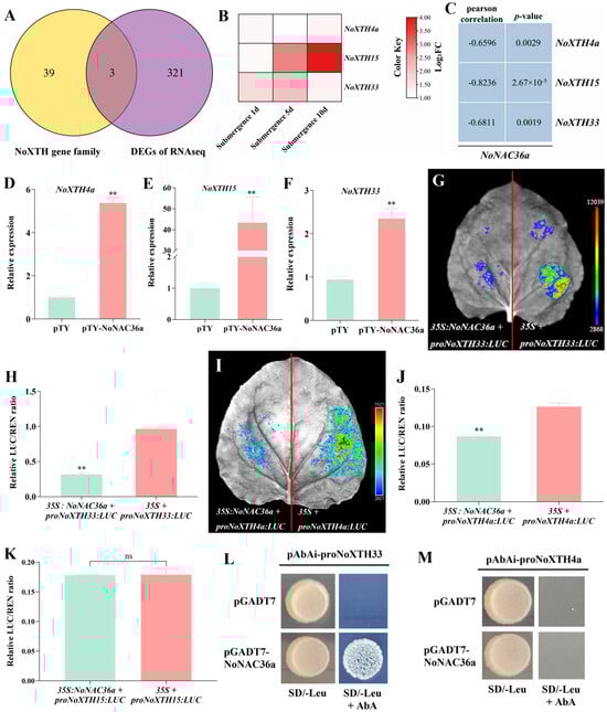 Interaction between NoNAC36a and promoter of NoXTH33, NoXTH4a, and NoXTH15. (A) The intersection of submergence transcriptome DEGs and NoXTH family. DEGs signify genes that exhibited significant differential expression at the three time points of submergence. (B) The expression levels of NoXTH33, NoXTH4a, and NoXTH15 in the transcriptome of stem segments after flooding treatment. Heatmap colors indicate the log2FC values of these three genes. The heatmap color ranges from white to red, indicating that the log2FC value is increasing. (C) Correlation analysis between NoNAC36a and NoXTH4a, NoXTH15, and NoXTH33 in the transcriptome. (D–F) The expression of NoXTH4a (D), NoXTH15 (E), and NoXTH33 (F) in silenced plants. Data represent mean ± SD with n = 3. Asterisks indicate significant differences: ** p < 0.01. (G) Fluorescence imaging of tobacco leaves after co-expression of 35S:NoNAC36a and proNoXTH33:LUC. (H) Determination of luciferase activity in leaves after co-expression of 35S:NoNAC36a and proNoXTH33:LUC. Data represent mean ± SD with n = 3. Asterisks indicate significant differences: ** p < 0.01. (I) Fluorescence imaging of tobacco leaves after co-expression of 35S:NoNAC36a and proNoXTH4a:LUC. (J,K) Determination of luciferase activity in leaves after co-expression of 35S:NoNAC36a and proNoXTH4a:LUC (J), 35S:NoNAC36a and proNoXTH15:LUC (K). Data represent mean ± SD with n = 3. Asterisks indicate significant differences: ** p < 0.01. ns indicates no significance. (L,M) The results of yeast one-hybrid between NoNAC36a and proNoXTH33 (L), NoNAC36a and proNoXTH4a (M). AbA indicates aureobasidin A.