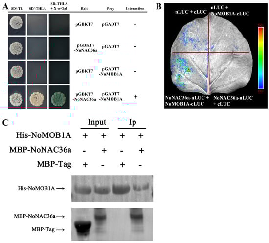 Interaction between NoNAC36a and NoMOB1A. (A) The yeast two-hybrid assay of NoNAC36a and NoMOB1A. (B) The interaction between NoNAC36a and NoMOB1A was verified via luciferase complementary assay. (C) The interaction between NoNAC36a and NoMOB1A was verified via pull-down assay. The beads used in this assay were His–agarose beads (Beyotime, Shanghai, China).