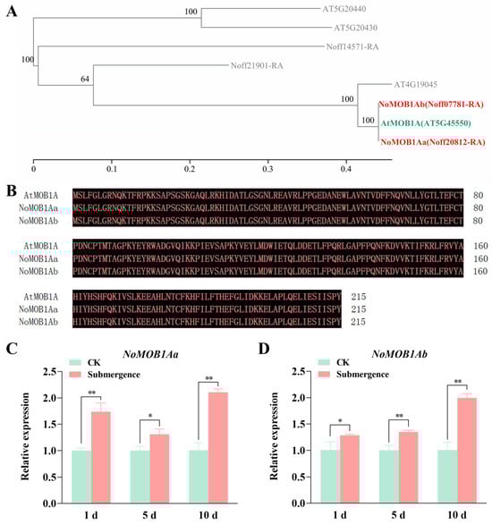 Sequence alignment and expression patterns of NoMOB1A. (A) Search for the most homologous gene to AtMOB1A in the watercress genome. Genes presented in red color designate NoMOB1Aa and NoMOB1Ab, gene presented in green color denotes AtMOB1A. (B) Protein sequence alignment of NoMOB1A and AtMOB1A. (C,D) The expression level of NoMOB1Aa (C) and NoMOB1Ab (D) in watercress stems under flooding stress. Data represent mean ± SD with n = 3. Asterisks indicate significant differences: * p < 0.05, ** p < 0.01.