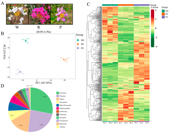 Metabolite analysis. (A) Lagerstroemia indica has three colors of petals (white, red, and purple); (B) two-dimensional PCA results of three different colors of crape myrtle samples; (C) cluster heatmap of all metabolite contents (clustering of metabolites and samples); (D) comprehensive analysis of flavonoid metabolite components.