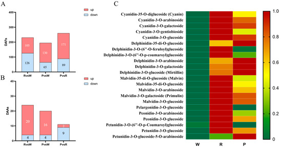 Differential metabolite analysis. (A) Analysis of differential flavonoids in the R vs. W, P vs. W, and P vs. R groups; (B) analysis of differential anthocyanin metabolites in the R vs. W, P vs. W, and P vs. R groups; (C) thermogram of upregulated anthocyanin metabolites in R vs. W and P vs. W.