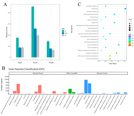 Transcriptome analysis. (A) Analysis of significantly different genes in the R vs. P, W vs. P, and W vs. R groups; (B) GO annotation enrichment analysis; (C) KEGG annotation enrichment analysis.