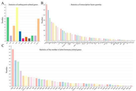 Given the crucial role of transcription factors (TFs) in anthocyanin synthesis, we analyzed TF expression across all samples. We identified putative TFs from the transcription annotation file using the keyword ‘transcription factors’, calculated their number and categories, and sorted them using the Chiplot webpage (https://www.chiplot.online/, accessed on 10 September 2024).