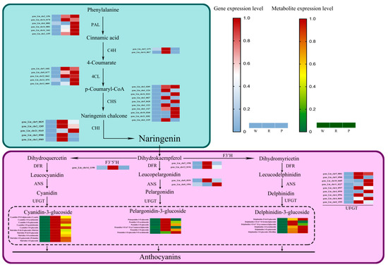 Based on transcriptome data, we constructed simplified models of the anthocyanin biosynthesis pathways in the three types of L. indica petals (Figure 5). These models illustrate the anthocyanin synthesis pathway starting from phenylalanine and show higher expression levels of PAL, C4H, 4CL, CHS, CHI, F3′H, F3′5′H, DFR, ANS, UFGT, and other genes in R and P petals compared with W petals.