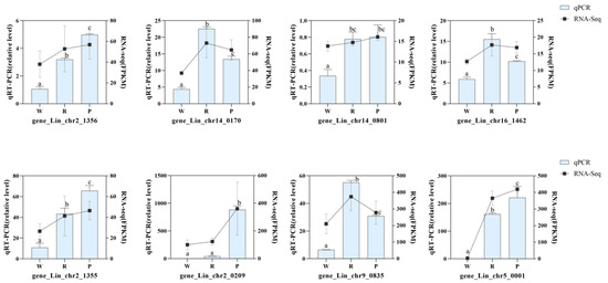 qRT-PCR validation of gene expression level in the transcriptome. Data are shown as mean ± standard deviation of three biological replicates. Different letters indicate significant differences among three species of Lagerstroemia indica in qRT-PCR validation (p < 0.05).