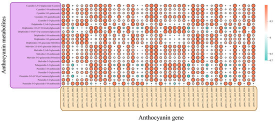 Correlation analysis between 42 anthocyanin-related genes and 22 anthocyanin metabolites (the circle size represents the correlation coefficient, and the color range in the bar chart from red to green displays the correlation coefficient of the color gradient, ranging from 1 to −0.7).