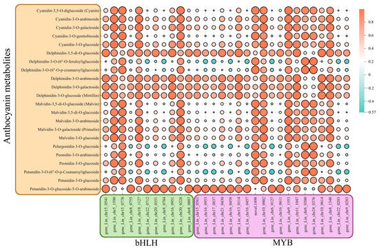 Correlation analysis between MYBs and bHLHs and 22 anthocyanin metabolites (the circle size represents the correlation coefficient, and the color range in the bar chart from red to green displays the correlation coefficient of the color gradient, ranging from 1 to −0.57).