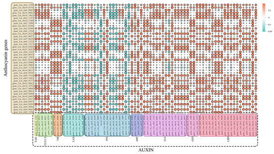 Correlation analysis between plant auxin-related genes and 42 anthocyanin synthesis-related genes (the circle size represents the correlation coefficient, and the color range in the bar chart from red to green displays the correlation coefficient of the color gradient, ranging from 1 to −0.99).