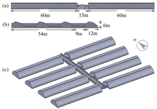 As seen in Figure 1, the solar greenhouse cluster was made up of eight identical energy-saving solar greenhouses. The dimensions of every solar greenhouse were 12 m in width, 60 m in length, and 6 m in height. The greenhouse’s ventilation system was a combination of bottom and top ventilation, with two 60 m by 1 m ventilation openings. The greenhouses were joined by the mechanized corridor. The separation between neighboring greenhouses was 15 m in the east and 9 m in the south. The corridor was 72.5 m long in the north–south direction, with a height of h (3.2, 3.7, 4.2, 4.7, 5.2 m) and a width of w (4, 5, 6, 7 m). The two ways the corridor was ventilated were the top and bottom ventilation. The top window had a width of 0.5 m and a length of 72.5 m. The bottom window had various bottom ventilation openings η (10%, 30%, 50%, 70%, and 90%) set, and it measured 1 m wide by 72.5 m long from the ground.