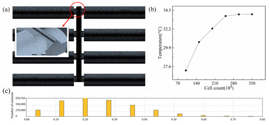The greenhouse and corridor’s mesh details are displayed in Figure 2a. The accuracy of the simulation results varies depending on the mesh quantity [25]. Temperature was used to confirm the convergence of simulations with various mesh quantities. The results remained stable when the mesh quantity reached 2.45 × 104 (Figure 2b). The grid quality is shown in Figure 2c. To ensure the accuracy of simulation calculations, this study selected a mesh model of this size. Using three different time steps of 1 s, 5 s, and 10 s, the temperatures were almost the same. A maximum acceptable time step of 10 s was selected, considering the computational cost. The hexahedral mesh was used to divide the model, and local meshes were refined to increase the computational accuracy so that the mesh distortion was less than 0.7 [26].