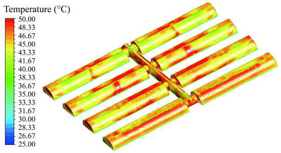 The temperature distribution across the greenhouse and corridor surfaces is depicted in Figure 3. The solar greenhouse cluster’s corridors have an unequal distribution of heat, which negatively affects the greenhouse’s internal temperature distribution. To effectively control the temperature and humidity distribution in the corridor, this study simulated the structural parameters, ventilation techniques, wind speed, and direction of the corridor.