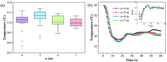 At a height of h = 4.2 m, Figure 5a displays the temperature distribution of corridors with varying widths. A combination of top and bottom ventilation is used. The temperature is generally higher and varies greatly when w = 4 m. For the 5 and 6 m wide corridors, there are variations in the quantity of anomalous data points as well as in the stability of temperature data. The overall uniformity and temperature distribution are better in the 7 m corridor. From Figure 5b, during 0~10 s, the influence of corridor width on the temperature field is essentially the same. At different times, the influence of w on the temperature field exhibits distinct patterns. Corridors with varying widths may affect the temperature field similarly in short times, but certain widths of corridors may see minor or large temperature increases in particular times. A corridor of w = 5 m is the most appropriate, considering both the ventilation impact and construction cost.