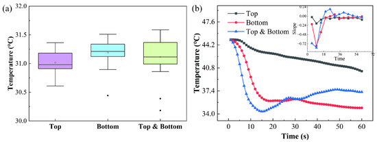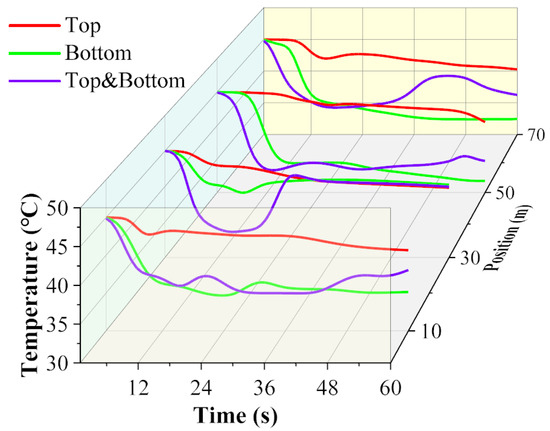The corridor temperature and its variations over time under various ventilation methods are displayed in Figure 7a and Figure 7b, respectively, to further compare their cooling effects. The average temperature determined at various points during a 40 s corridor ventilation period is displayed in Figure 7a. The corridor with only the top window open currently has the lowest and most consistent temperature. This may be because the hot air is effectively expelled from the corridor at this time. However, since this is an immediate effect, it does not follow that simply opening the top window for ventilation is preferable. The average temperature is highest but the temperature distribution within the corridor is more uniform when only the bottom window is open. Extremely low temperatures occur when the bottom and top windows are open at the same time, creating the most uneven temperature distribution in the corridor. This represents that the airflow inside the corridor is the most intense under this ventilation method.