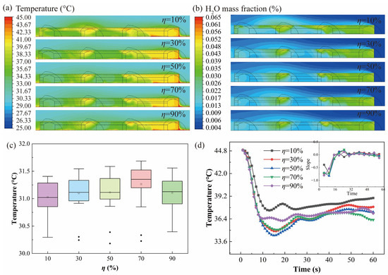 As can be observed from Figure 9d, the temperature is high, the cooling threshold is at its smallest, and the fluctuations are significant when η = 10%. After 10 s of cooling, the temperature stops dropping when η = 90% and progressively gets closer to a steady state. This suggests that the temperature will not drop to its absolute minimum with excessive ventilation. When η = 30%, 50%, and 70%, the indoor temperature rebounds within 10 s to 30 s. After 30 s, the temperature tends to stabilize, with a lower temperature at η = 70%, indicating the best ventilation effect.