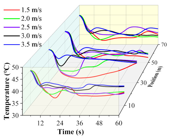 Variations in temperature over time at different positions of the corridor with varying wind speeds.