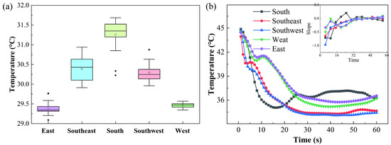 Figure 11a illustrates how the temperature inside the corridor exhibits a specific trend as the wind direction gradually varies from the east to the south. When the east and west winds are blowing downward, the temperature inside the corridor is lower and the data distribution is more concentrated. The optimal ventilation effect is achieved at this point because the airflow is perpendicular to the corridor opening and passes straight through it. When the south wind is blowing downward, the temperature is the highest. The airflow is parallel to the corridor’s windows, making it difficult for air to enter the corridor. It is evident from Figure 11b that the trend of temperature variations varies with wind direction. The trends of the west and east directions almost overlap, suggesting that these two directions influence temperature regulation in a comparable way. After 10 s, the decline stops and experiences a brief rebound before continuing to decline again, gradually increasing after 40 s. The wind direction has a symmetrical effect on corridor ventilation. The greater the velocity component of the airflow perpendicular to the window, the more beneficial the ventilation is [31].