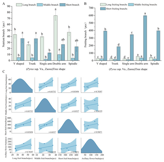 Effects of different (Pyrus ssp. Va., Zaosu) tree shapes on branches and flower buds: (A) number of nutrient branches; (B) number of fruiting branches; (C) relationship between the number of fruiting branches and axillary bud. (The dots represent the variables, the lines are the fit curves, the shaded areas represent the 95% confidence bands, and the diagonals are the distribution curves for each variable.) The data are presented as mean ± standard error of three biological replicates. Different lowercase letters indicate significant differences (p < 0.05).