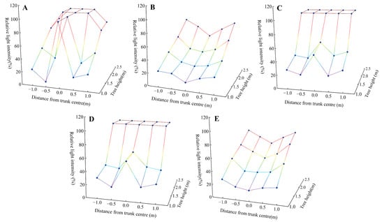 Relative light intensity in the canopy of different (Pyrus ssp. Va., Zaosu) tree shapes: (A) Y shape; (B) trunk; (C) single-arm; (D) double-arm; (E) spindle. Different colors represent different ranges of light intensity.