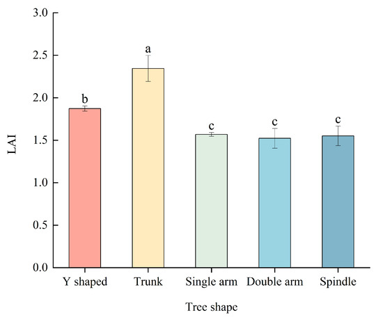 Effect of different (Pyrus ssp. Va., Zaosu) tree shapes on leaf area index. The data are presented as mean ± standard error of three biological replicates. Different lowercase letters indicate significant differences (p < 0.05).