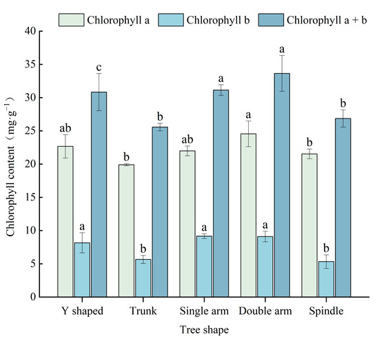 Effect of different (Pyrus ssp. Va., Zaosu) tree shapes on chlorophyll content. The data are presented as mean ± standard error of three biological replicates. Different lowercase letters indicate significant differences (p < 0.05).